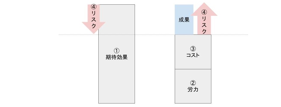 「①期待効果」「②労力」「③コスト」「④リスク」図解